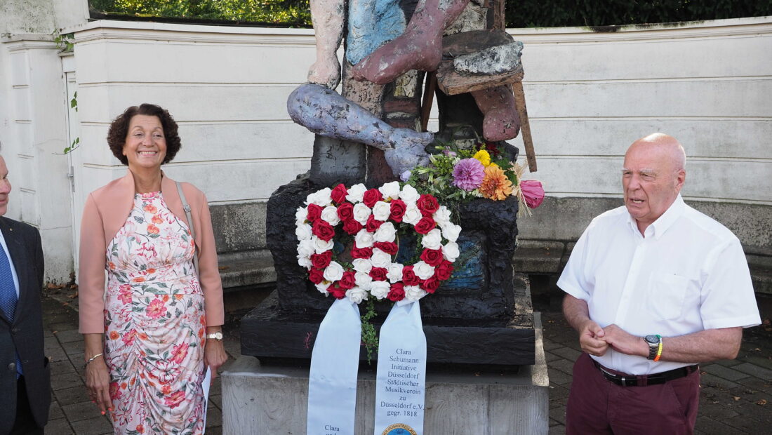 Am 12.9. fand sich eine kleine Gruppe Schumannfreundinnen und -freunde kurz vor 11.00 Uhr am Denkmal ein und sahen schon von weitem das Gesteck in Form zweier Eheringe, geschmückt mit Rosen in den Farben Rot und Weiß. Manfred Hill begrüßte die Gäste und erläuterte die bereits in der vorgenannten Einladung dargestellte Besonderheit des Doppeldenkmals. Besondere Freude brachte er darüber zum Ausdruck, dass Düsseldorfs Bürgermeister Josef Hinkel, aber auch die Direktorin des Heinrich-Heine-Instituts, Frau Dr. Sabine Brenner-Wilczek, zur kleinen Ehrung gekommen waren. Ein weiteres herzliches Willkommen galt der Familie Aengevelt. Ohne Dr. Wulf Aengevelt, dem Kunstgießer Karl-Heinz Schmäke und Prof. Markus Lüpertz könnten wir uns nicht dieses Denkmals erfreuen. Manfred Hill brachte auch seine Freude darüber zum Ausdruck, dass Düsseldorf nicht nur ein Denkmal für das Künstlerpaar vorweisen kann, sondern dass mit der nahenden Eröffnung des Schumannhauses Düsseldorf ein großes Ereignis bevorsteht. In diesem Zusammenhang würdigte er auch die Anwesenheit des Sprechers des Fördervereins Schumannhaus, Herrn Dr. Edgar Jannott, der mit seiner lieben Frau Ingrid Jannott, zum Denkmal gekommen war.