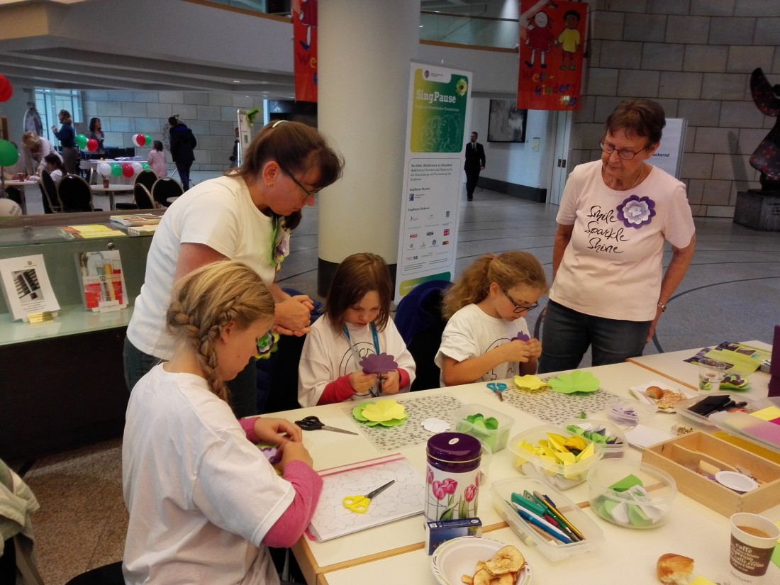 Weltkindertag in Düsseldorf und der Städtische Musikverein war präsent. Mit einem großen Stand in der Bürgerhalle des Landtages NRW präsentierte sich der Städtische Musikverein zu Düsseldorf e.V. gegr. 1818 und stelle in besonderer Weise sein Projekt „SingPause“-Singen in Düsseldorfer Grundschulen heraus. Viele Kinder kamen an den Stand und bastelten begeistern Papierblumen. Die dafür notwendigen Utensilien hatte Musikvereinsschatzmeisterin Teresa Petrik ebenso liebevoll vorbereitet wie eine große Menge Waffelteig. Fast 6 Stunden wurden Blumen gebastelt und Waffeln gebacken. Musikvereinschordirektorin Marieddy Rossetto war mehrere Stunden im Einsatz genauso wie Musikvereinsschriftführerin Kristina Miltz und die ihr helfenden Damen Karen Baasch, Marianne Rasp, Gabriella Faludi und Sandra Wolfsberger. Viele Gäste besuchten den Stand und es gab viele begeisterte Elternkommentare von SingPause-Kindern über das Projekt „SingPause“ und über die Konzerte in der Tonhalle Düsseldorf.