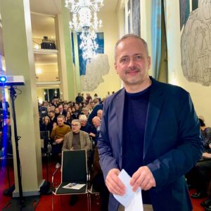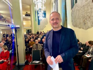 Beitragsbild: Prof. Gernot Wolfram im Foyer der Oper vor einer großen Schar von Zuhörerinnen und Zuhörern.